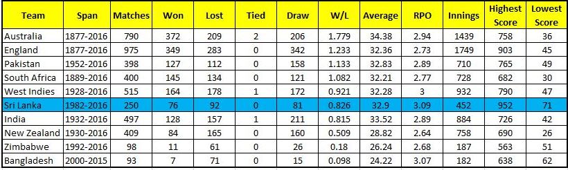 Sri Lanka made the first appearance in test cricket on 17th of February 1982 in Colombo against England in which Sri Lanka lost the match by 7 wickets.  The second test against Australia in Galle during 2016/17 season is their 250th test appearance which implies it took 34 years for them to play their 250th test match on 4th of August 2016. Perhaps this match was the 253rd test match for Sri Lanka officially  but due to the cancellation of 3 matches during the period, effectively this became as the 250th test match. Sri Lanka could achieve their first test win in their 14th appearance against India and they won with a huge margin of 149 runs. Until the 249th test match they have 76 wins , 92 losses & 81 draws and have Win/Loss percentage of 0.826