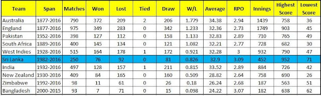 This article was written in order to just for a recap about Sri Lanka's performances in tests. Sometimes the facts may not be in an order. Apologizes for them. I would like to write about some memorable test wins of Sri Lanka in my next article only because I am proud to be Sri Lankan cricket fan.