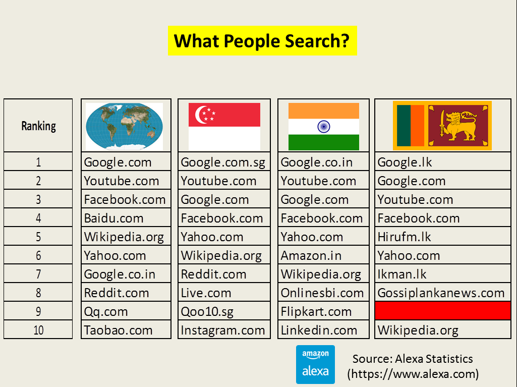 We Sri Lankans are always different in every aspect. Alexa, a subsidiary company of Amazon who tracks the website traffic and rank websites in the browsing preference. I will take three scenarios, first the global rankings, then the country we always love to be like, Singapore. Third is our nearest nation India. People in other part of the world search for the content which is useful for them. Look what we are searching in the internet. BTW the red cell is an adult content site. The main point that I love is in India people are well ahead than us. They browse online shopping sites like Amazon, Flipkart and especially Onlinesbi is the online portal of SBI bank. But as a proud nation we search for gossips and adult contents. Among Sri Lankan top 50 browsing sites, there are 10 adult content sites and 15 gossip related sites. As a nation where we are heading to? That’s why I would say Mind your search